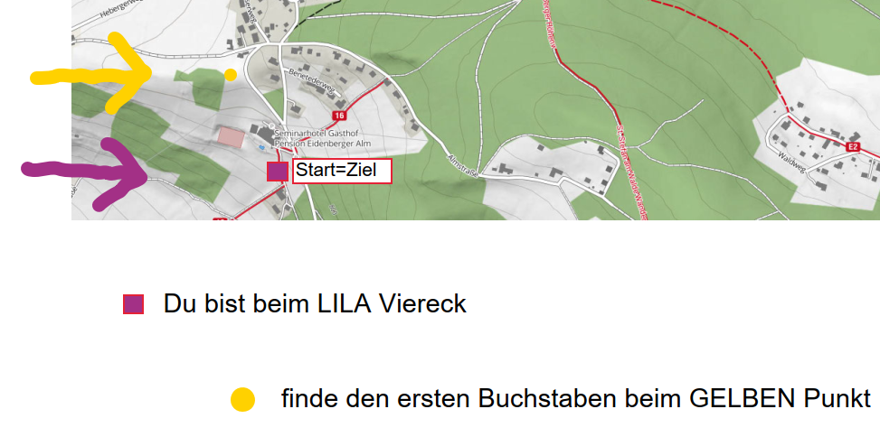 Am Programm steht ein „Orientierungslauf“. Anhand von Geländekarten sind verschiedene Markierungspunkte zu suchen. Bei diesen Punkten gibt es jeweils einen Buchstaben zu notieren. Mit den gesammelten Buchstaben ist im Ziel das Lösungswort zu bilden. Für jede ausgefüllte Lösungskarte gibt es eine kleine Überraschung.