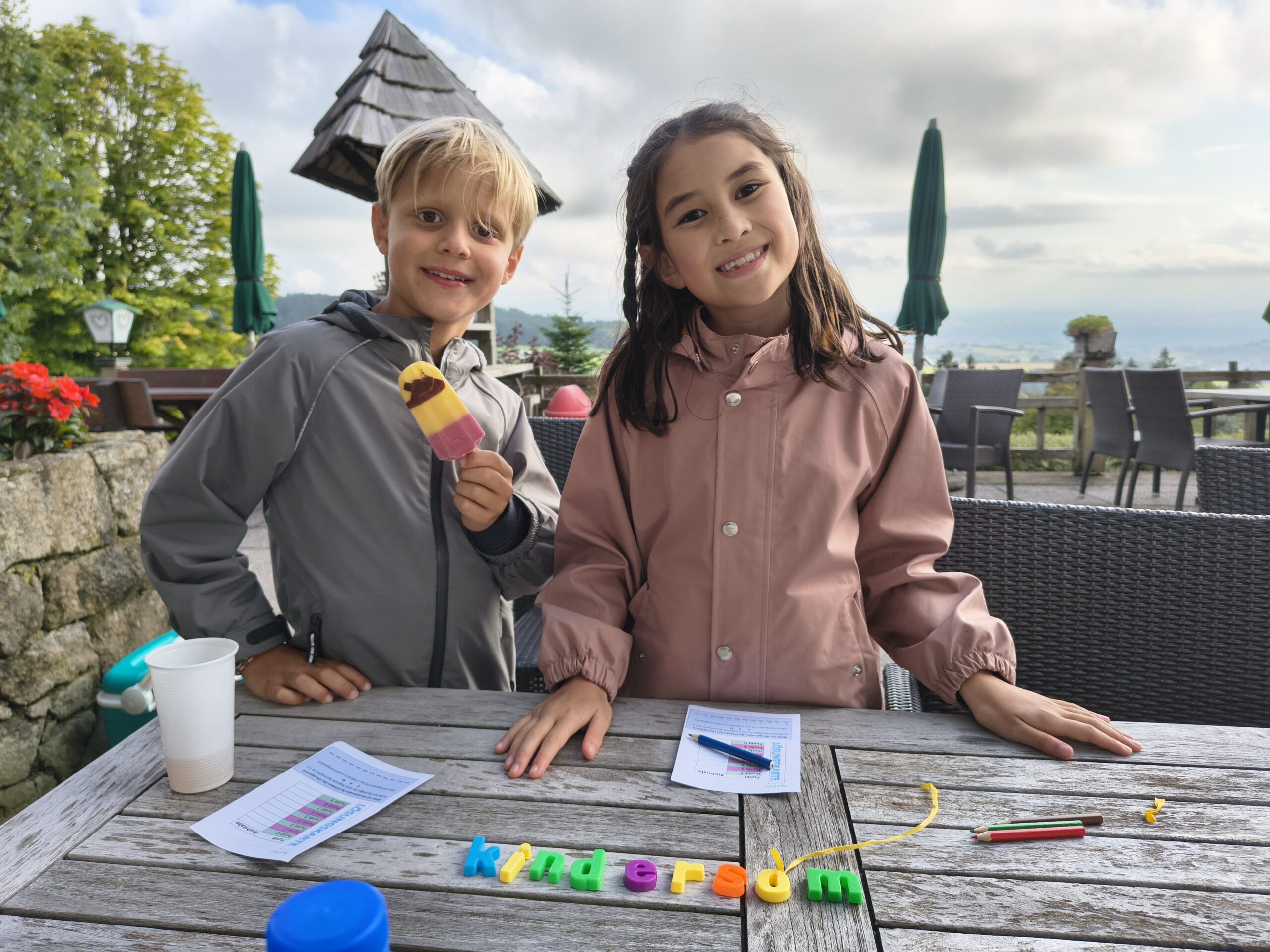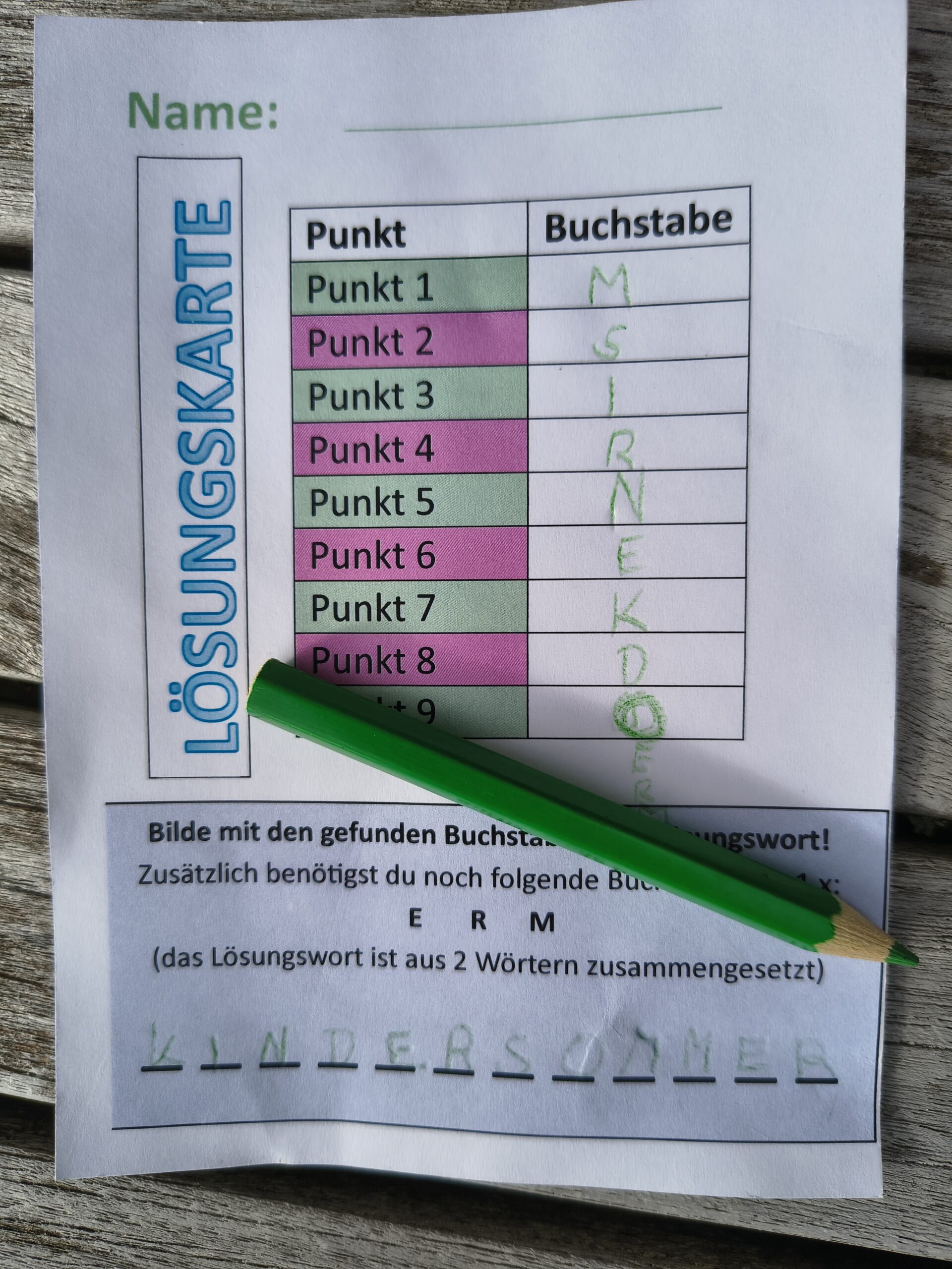 Pünktlich zum Treffpunkt um 16 Uhr begann es zu regnen, der Regen hielt aber zum Glück nicht lange an. Die wetterfesten und motivierten Kinder machten sich auf die Suche nach den Markierungspunkten. Bei jedem Punkt wurde ein Buchstabe in die Lösungskarte eingetragen. Zwischendurch wurde in der Staubgasse auch ein Eintrag ins Gipfelbuch gemacht. Nach 6 km langer Wanderung und 9 gefundenen Buchstaben waren die Schüler wieder am Ausganspunkt. Das Lösungswort war schnell gefunden und als Belohnung wartete eine Eis.