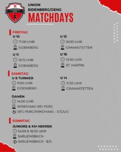 Das Wochenende bietet erneut ein abwechslungsreiches Programm für alle Fußballfans. Vier Nachwuchsteams sind bereits am Freitag im Einsatz. Ein besonderes Highlight ist dann das U8-Turnier am Samstag auf heimischer Anlage. Alle Eltern, Omas, Opas, Geschwister und Interessierten sind herzliche eingeladen, unsere jungen Talente zu unterstützen. Die Damen werden am Samstag auswärts antreten und unsere Herren gehen nach dem intensiven 4:3-Sieg gegen Admira mit Selbstvertrauen in das Aufeinandertreffen mit dem derzeitigen Ligaprimus Sarleinsbach. Wir wünschen allen Teams viel Erfolg – und allen Fans viel Spaß beim Anfeuern!