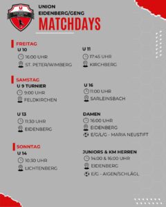 Am Samstag bestreiten unsere Damen ihr Heimspiel um 16:00 Uhr. Am Sonntagnachmittag betreten zunächst die Juniors das Feld, zwei Stunden später kommt es zum Duell der Kampfmannschaften von Eidenberg/Geng und Aigen. Alle Fans dürfen sich auf spannende Begegnungen freuen. An diesem Wochenende stehen darüber hinaus zahlreiche Nachwuchspartien auf dem Programm. Unsere Matchdays-Übersicht liefert dir wieder alle Anstoßzeiten.
