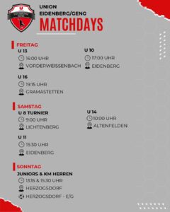 Wir sind mittendrin im heißen Herbst. Für unsere Kampfmannschaft stehen noch vier Begegnungen bis zur Winterpause auf dem Spielplan. Die finale Phase der Hinrunde wird durch das Auswärtsduell in Herzogsdorf eingeläutet. Sowohl unsere Juniors als auch unsere Kaderakteure sind bestrebt, voll auf Sieg zu spielen. An diesem Wochenende sind auch wieder alle unsere Nachwuchsteams im Einsatz. Unsere Übersicht liefert dir alle Termine und Anstoßzeiten.