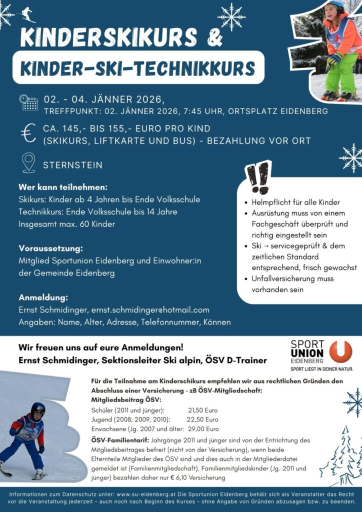 Die Sektion Ski Alpin der Sportunion Eidenberg veranstaltet auch in diesem Winter wieder den traditionsreichen Kinderskikurs. Alle Infos gibt es unten. Wir freuen uns auf viele Anmeldungen!