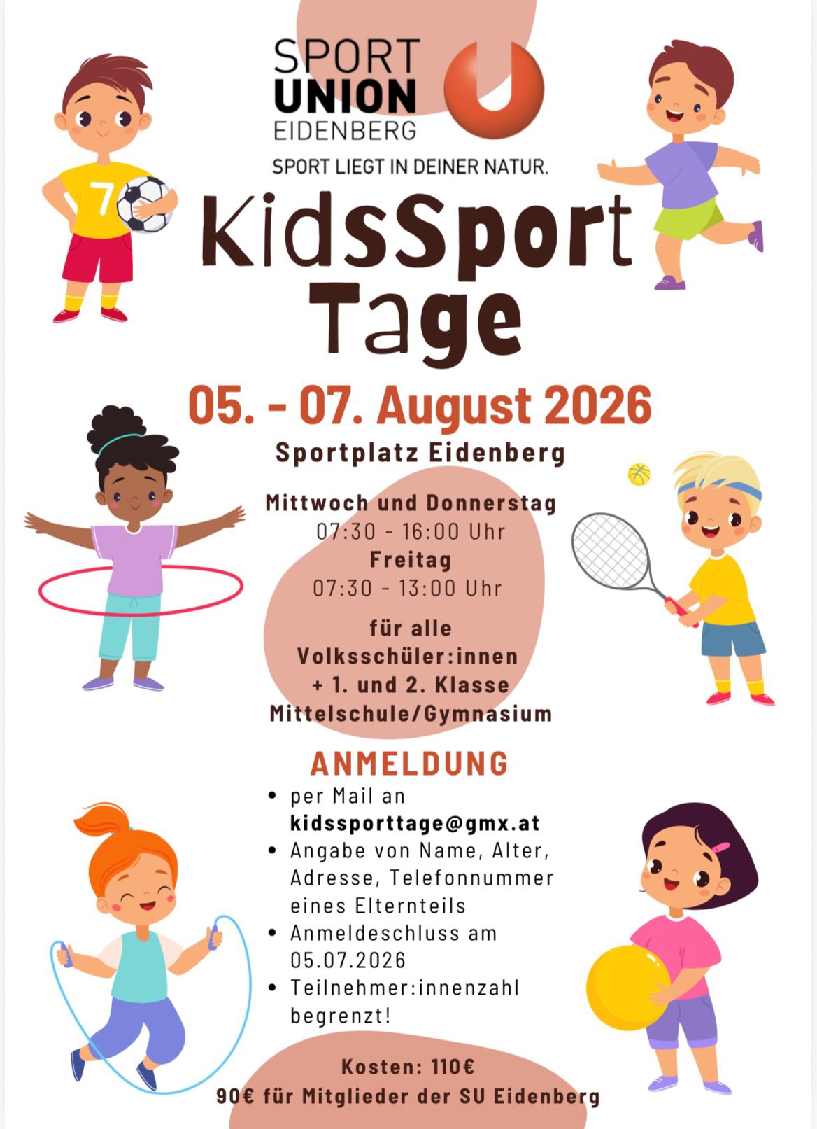 Die Sportunion Eidenberg hat in diesem Sommer eine Besonderheit im Angebot: Erstmals führen wir die KidsSportTage durch. Von Mittwoch, 5. August bis Freitag, 07. August hast du die Möglichkeit, verschiedene Sportarten auszuprobieren. Alle Infos findest du in unserer Einladung: KidsSportTage